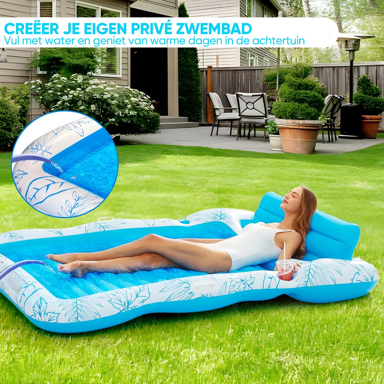 Ontspan stijlvol op onze oversized opblaasbare drijfmatras—ontworpen voor volwassen comfort, perfect voor zonnige dagen bij het zwembad, stranduitjes en loungen bij het meer.