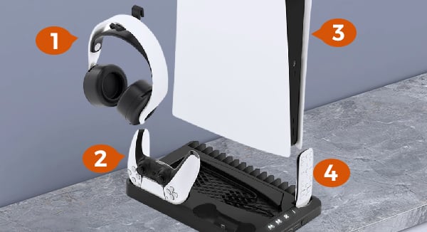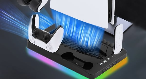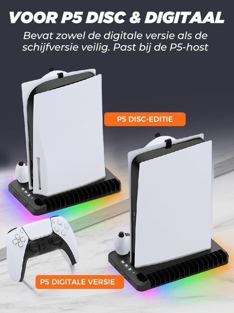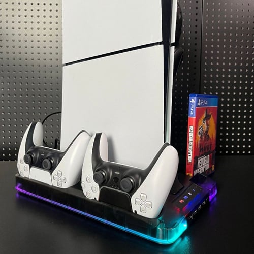 Deze standaard houdt mijn PS5 koel, laadt mijn controllers op en ziet er geweldig uit met de RGB-verlichting. Ik ben dol op de extra opslagruimte voor games en accessoires. Sterk aanbevelen!