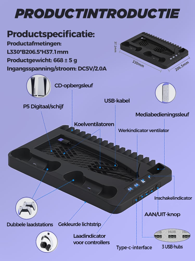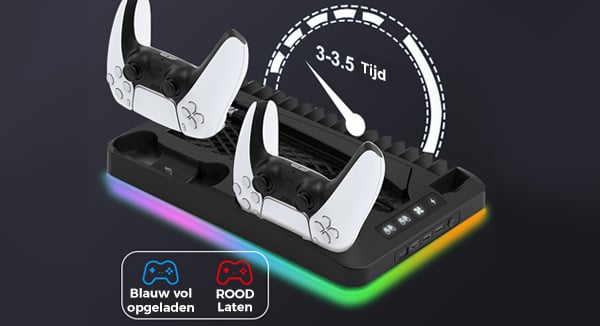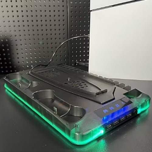 Deze standaard is perfect! Het laadt mijn controllers op, houdt mijn games vast en houdt alles netjes. De ventilator werkt prima voor koeling en de RGB-verlichting ziet er fantastisch uit!