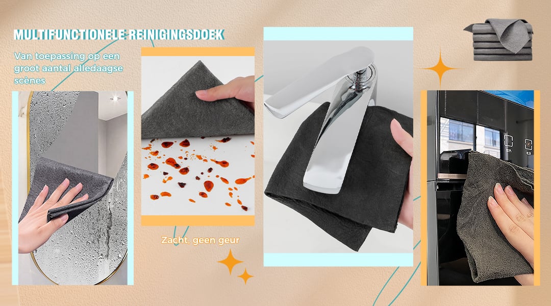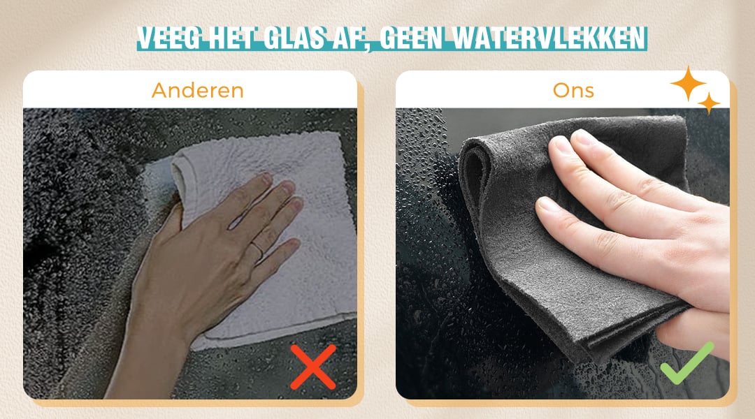 De microvezeldoeken zijn strak geweven waardoor ze geen pluisjes achterlaten! Gebruik ze om op je spiegels en ramen te drogen om het water te absorberen en die hardnekkige strepen te polijsten. Gebruik ze op elk glad, niet-poreus oppervlak!
