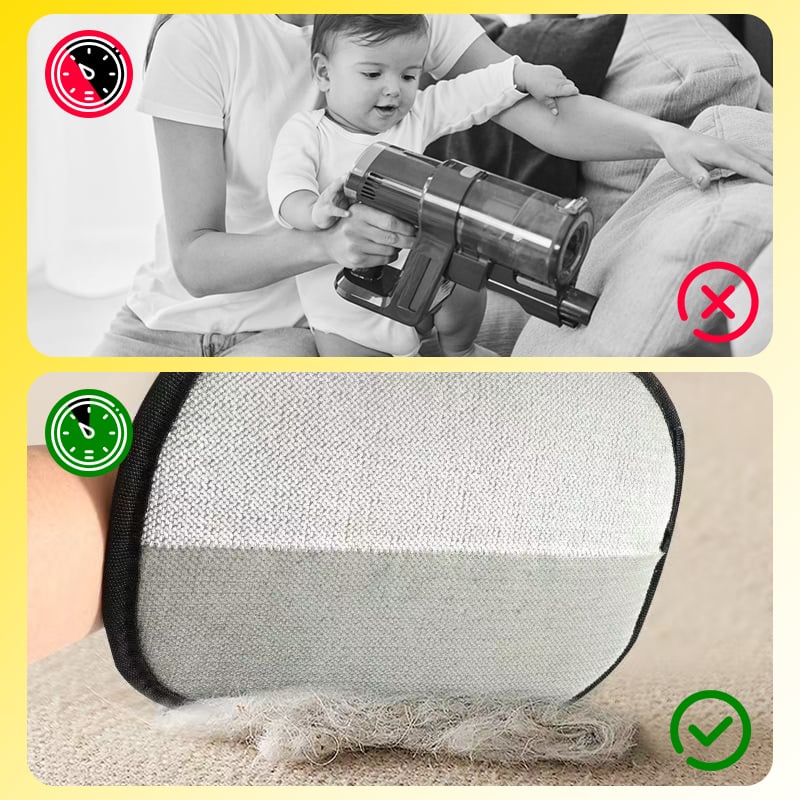 De tijd dat je je weekenden verspilde aan het bestrijden van dierenhaar is voorbij. Trek gewoon de handschoen aan, wrijf met lichte druk over elk oppervlak en zie hoe de haren zich in nette klontjes verzamelen voor gemakkelijke verwijdering. Wat eerst 30 minuten duurde met een stofzuiger, kost nu slechts enkele seconden.