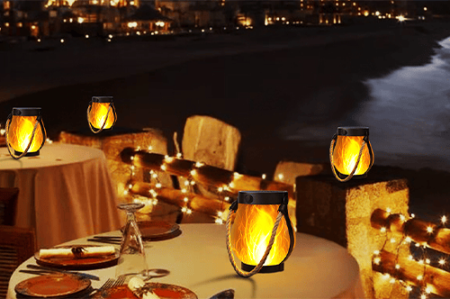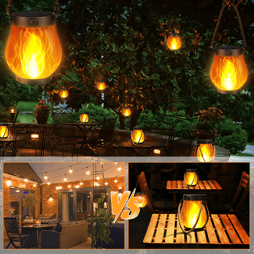 | Zonnetouwlamp met vlamlicht | Traditionele elektrische lichtsnoeren | Batterij-gevoede vlamlantaarns | |
