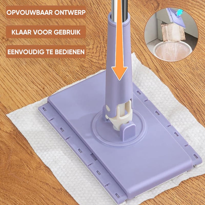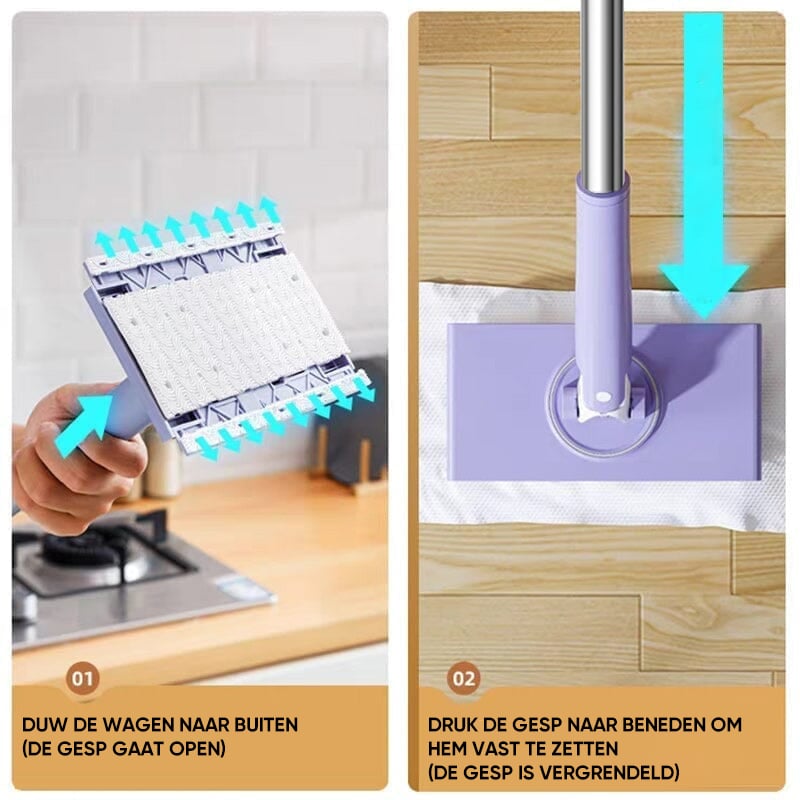 🧹 Handsfree bediening: Het duw-trek handgreepontwerp maakt direct handcontact overbodig bij het verwisselen van de dweildoek. Druk eenvoudig de handgreep naar beneden om de basis te openen en de doek automatisch vast te klemmen of los te laten — zonder vieze handen.