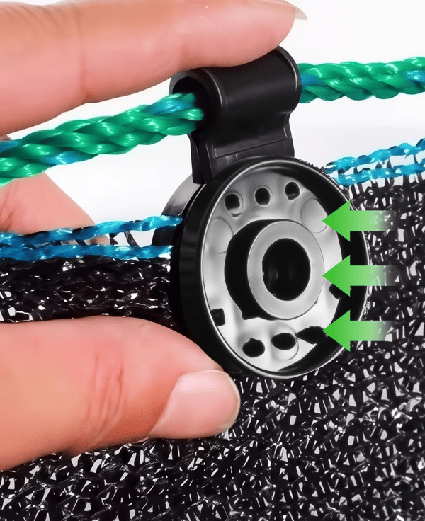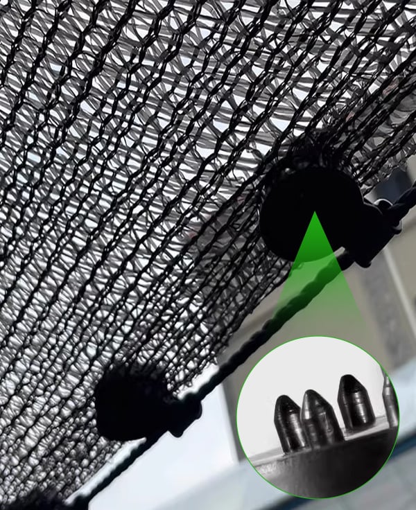 Gespecialiseerde tanden grijpen stevig vast en werken met verschillende doekdiktes, van schaduwnetten tot kassenfolie – blijven op hun plaats, zelfs bij winderige omstandigheden.